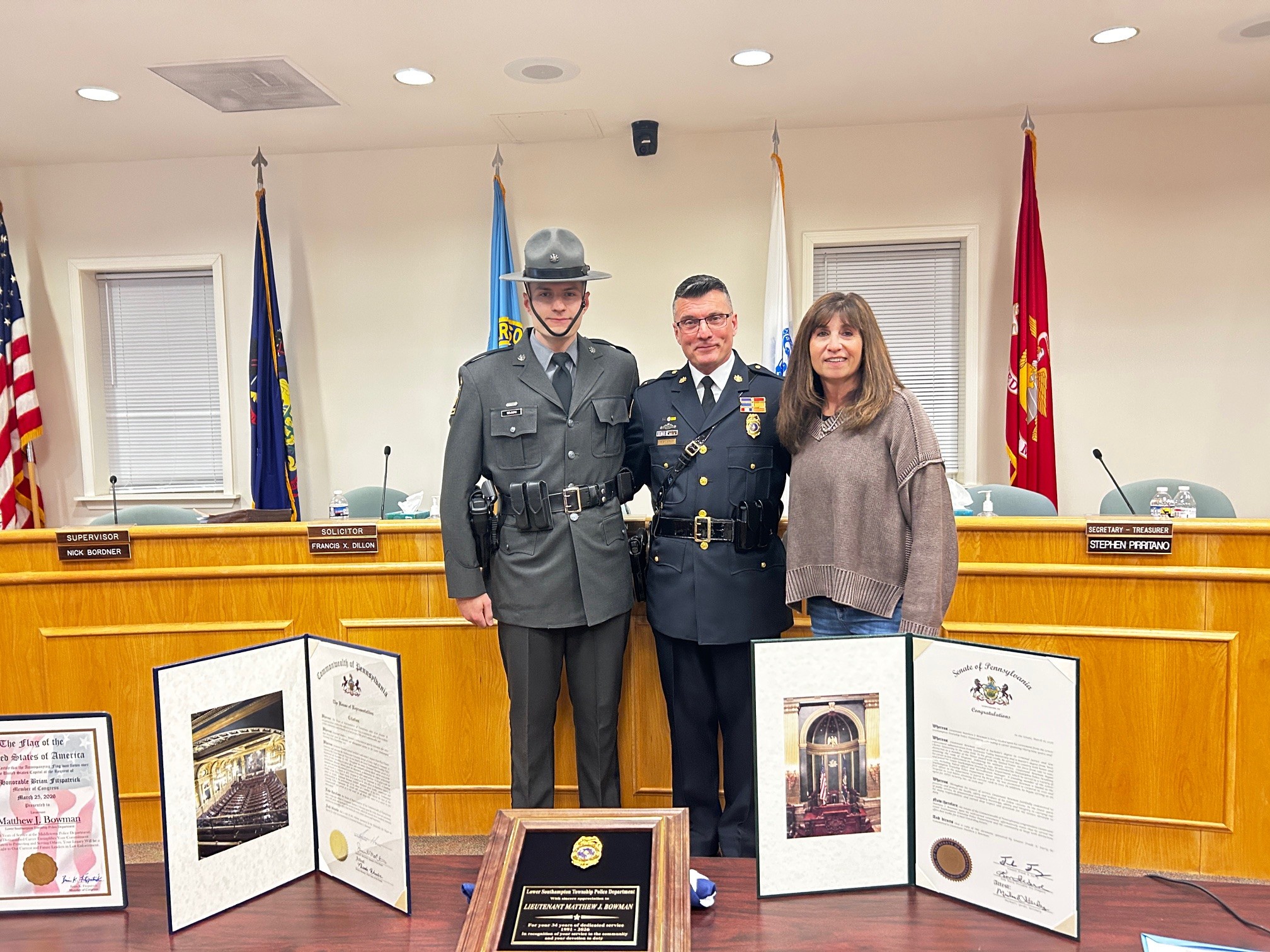 I was proud to help secure $181,697 in state funding for Nova Bucks County. This investment will allow them to complete critical building upgrades and security system improvements across their facilities in Bucks County. I joined Sen. Santarsiero, staff members of Sen. Coleman and Rep. Marcell, and members of the Bucks County Redevelopment Authority earlier this month to present the check to NOVA. We also received a tour of their Bucks County Children’s Advocacy Center, a child-friendly center, protecting the interests of children by facilitating a coordinated, child-centered response to child abuse reports and by promoting the rights and needs of at-risk and abused children. I am proud to support NOVA Bucks and the work they do every day protecting and supporting individuals and families impacted by crime. Find out more about what they do: Network of Victim Assistance – Bucks County, PA – NOVA Community Health and Safety EventsI am grateful to have attended two impactful community events last week— a community health fair hosted by Middletown Township and Penndel-Middletown Emergency Squad and a child safety symposium hosted by Tri-Hampton Rescue Squad. Both events brought together healthcare providers, first responders, and families to share important resources, from health screenings to child safety education. I am pictured here with my son Jacob at the symposium where I was especially proud to see Lenape Valley Foundation highlighting the FiRST Program—a peer support line for first responders and their loved ones in Bucks County. This program was the basis for legislation I authored, Act 69 of 2020. Rep. Schlossberg and I worked in a bipartisan effort on this bill that established a mental wellness and stress management protocol within the PA Department of Health. This law helps ensure that emergency responders have access to the support they need when facing post-traumatic stress and brain injuries. Honoring Retiring LieutenantCongratulations to Lieutenant Matthew J. Bowman on his retirement from the Lower Southampton Police Department after a thirty-nine-year career. While I was in Harrisburg, our staff presented Lt. with a citation from the Senate of Pennsylvania earlier this week for his many years of dedicated service protecting our community. Since beginning his career in 1991, Lt. Bowman has served with professionalism, leadership, and a strong commitment to the community. Over the years, he had a variety of roles, including patrol, community policing, and Accreditation Manager, helping uphold the department’s high standards. He rose through the ranks to Corporal, Sergeant, and most recently Lieutenant. A proud U.S. Air Force veteran, Lt. Bowman was also a founding member of the department’s Police Honor Guard and its first bicycle patrol officer. Bowman is pictured here with his wife, Siri, and his son Jarrett, a Pennsylvania State Trooper. I want to thank Lieutenant Bowman for his outstanding service and wish him all the best in a well-earned retirement with his family. Interested in Law Enforcement? Check Out This State Police Program