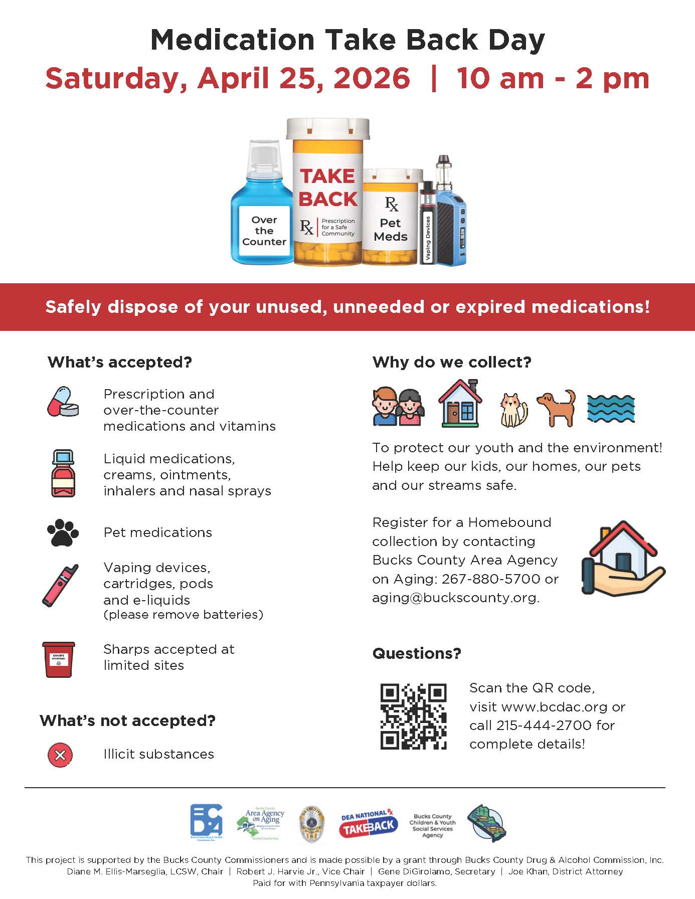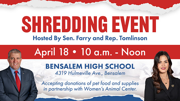 Upcoming EventsRep. Marcell and I are honored to be hosting a Veterans Expo for all veterans and their families in the 6th Senatorial district. This event will serve as a one-stop shop of resources for the veteran community and a meaningful way to salute their service in celebration of America’s 250th anniversary. No registration is required. Please contact our office at 215-638-1784 with any questions. To help residents guard themselves against identity theft, I partnered with our local state representatives to host FREE local shredding events. April 18, hosted with Rep. Tomlinson April 25, hosted with Rep. Marcell Saturday May 16, hosted with Rep. Hogan Saturday May 16 from 10 am to 12:00 pm at my district office, 370 East Maple Avenue in Langhorne. Residents of the 6th Senate District are encouraged to bring documents that contain sensitive information to be thoroughly shredded. Please note these events are for residents only, no businesses, please. Due to high demand, there is a limit of two file boxes of paper per individual to be shredded. We cannot accept plastic bags. Medication Take Back DayMedication Take Back Day is Saturday, April 25, 2026 from 10 am – 2 pm. This year’s Take Back event will feature 48 public collection sites throughout the county. Simply walk or drive up and drop in any unused, unneeded or expired medications for safe disposal. In addition to prescription medications, law enforcement officers will be collecting over-the-counter and pet medications, vitamins, vaping products and more. Plus, select sites throughout the county will be collecting medications and sharps and distributing Narcan on April 25. Visit https://www.bcdac.org/take-back-day-spring-2026 for site locations and what’s accepted. Can’t make it to Take Back Day? You can still safely dispose of your medications at one of the collection boxes located in Bucks County Police Departments. Find a box near you: https://tinyurl.com/v3ece48u. Senate Approves Bill Aiding Pennsylvanians with Invisible Disabilities During Police Interactions
