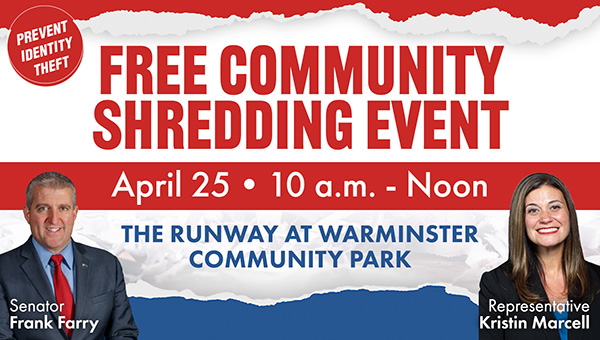 If you can not make it tomorrow, Rep. Hogan and I are hosting a shredding event on May 16th from 10am to noon at my district office, located at 370 East Maple Ave. in Langhorne. |