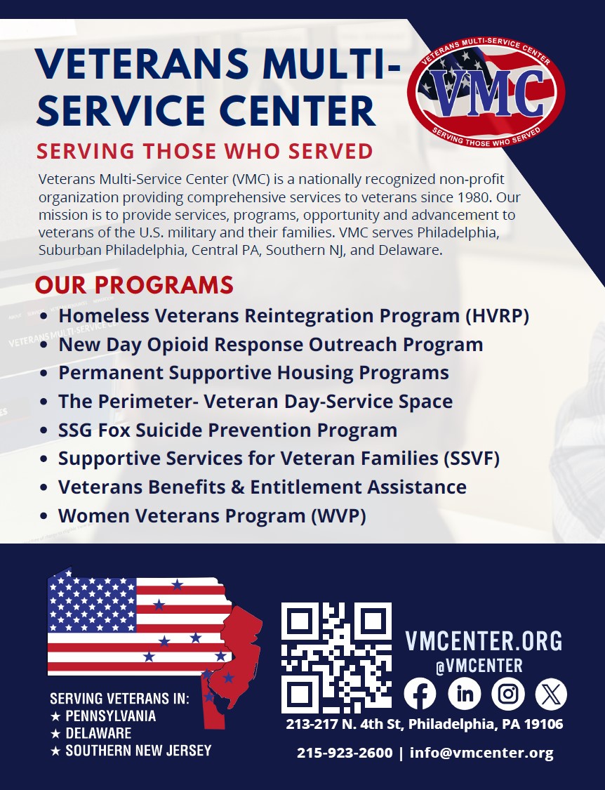 The Honor and Courage Foundation is dedicated to bringing hope and purpose to veterans and first responders suffering from the effects of PTSD and physical battle scars. They provide mentorship and support through various programs aimed at addressing the needs of veterans and law enforcement. The foundation’s mission is to honor the legacies of those who have served and to give hope and healing to those still in the fight. They are hosting their 1st Annual Gala on February 7th at the Fuge in Warminster. To find out more about the event or how you can support this important foundation, visit Events — Honor and Courage Foundation Veterans Multi-Service CenterVeterans Multi-Service Center offers many programs and resources to veterans and their families in our region, including their HVRP program that supports veterans who are seeking employment, training, and long-term stability, and who may also be experiencing housing instability. For more info on this program or any of their comprehensive programs, visit their website: HOME – VMC Ensuring Access to Veterans Assistance Programs Across Pennsylvania